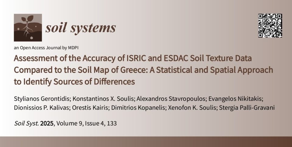 🌱📢Proud to share a 𝗻𝗲𝘄 𝗽𝘂𝗯𝗹𝗶𝗰𝗮𝘁𝗶𝗼𝗻 from the 𝗚𝗜𝗦 𝗥𝗲𝘀𝗲𝗮𝗿𝗰𝗵 𝗨𝗻𝗶𝘁 at the Agricultural University of Athens (gis.aua.gr) in 𝘚𝘰𝘪𝘭 𝘚𝘺𝘴𝘵𝘦𝘮𝘴! 𝘼𝙨𝙨𝙚𝙨𝙨𝙢𝙚𝙣𝙩 𝙤𝙛 𝙩𝙝𝙚 𝘼𝙘𝙘𝙪𝙧𝙖𝙘𝙮 𝙤𝙛 𝙄𝙎𝙍𝙄𝘾 𝙖𝙣𝙙 𝙀𝙎𝘿𝘼𝘾 𝙎𝙤𝙞𝙡 𝙏𝙚𝙭𝙩𝙪𝙧𝙚 𝘿𝙖𝙩𝙖 𝘾𝙤𝙢𝙥𝙖𝙧𝙚𝙙 𝙩𝙤 𝙩𝙝𝙚 𝙎𝙤𝙞𝙡 𝙈𝙖𝙥 𝙤𝙛 𝙂𝙧𝙚𝙚𝙘𝙚: 𝘼 𝙎𝙩𝙖𝙩𝙞𝙨𝙩𝙞𝙘𝙖𝙡 𝙖𝙣𝙙 𝙎𝙥𝙖𝙩𝙞𝙖𝙡 𝘼𝙥𝙥𝙧𝙤𝙖𝙘𝙝 𝙩𝙤 𝙄𝙙𝙚𝙣𝙩𝙞𝙛𝙮 𝙎𝙤𝙪𝙧𝙘𝙚𝙨 𝙤𝙛 𝘿𝙞𝙛𝙛𝙚𝙧𝙚𝙣𝙘𝙚𝙨 Our study evaluates global and European soil texture datasets against Greece’s national soil map (>10,000 samples). Results reveal significant discrepancies and low predictive accuracy, emphasizing the need for improved models in heterogeneous landscapes. Read the full article: https://lnkd.in/eyMyTmpP Authors: Stylianos Gerontidis, Konstantinos X. Soulis, Alexandros Stavropoulos, Evangelos Nikitakis, Dionissios P. Kalivas, Orestis Kairis, Dimitrios Kopanelis, Xenofon K. Soulis and Stergia Palli-Gravani