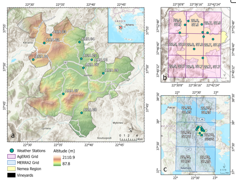Read the full publication here: https://www.mdpi.com/2073-4433/16/3/263 Abstract AgERA5 (ECMWF) is a relatively new climate dataset specifically designed for agricultural applications. MERRA-2 (NASA) is also used in agricultural applications; however, it was not specifically designed for this purpose. Despite the proven value of these datasets in assessing global climate patterns, their effectiveness in small-scale agricultural contexts remains unclear. This research aims to fill this gap by assessing the suitability and performance of AgERA5 and MERRA-2 in precision irrigation management, which is crucial for regions with limited ground data availability. The wine-making region of Nemea, Greece, with its complex and challenging terrain is used as a characteristic case study. The datasets are assessed for key weather variables and for irrigation planning, using detailed local meteorological station data as a reference. The results reveal that both products have serious limitations in small scale irrigation scheduling applications in contrast to what was reported in previous studies for other regions. The uneven performance of global datasets in different regions due to lack of sufficient observation data for reanalysis data calibration was also indicated. Comparing the two datasets, AgERA5 outperforms MERRA-2, especially in precipitation and reference evapotranspiration. MERRA-2 shows comparable potential in irrigation planning, as it occasionally matches or exceeds AgERA5’s performance. The study findings underscore the importance of evaluating metanalysis datasets in the application area before their use for precision agriculture, particularly in regions with complex topography.